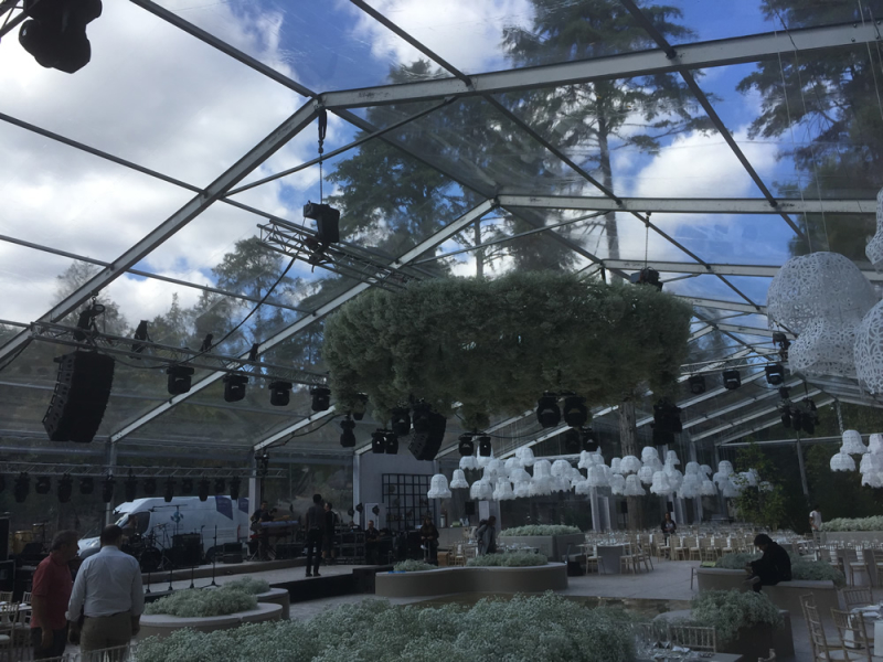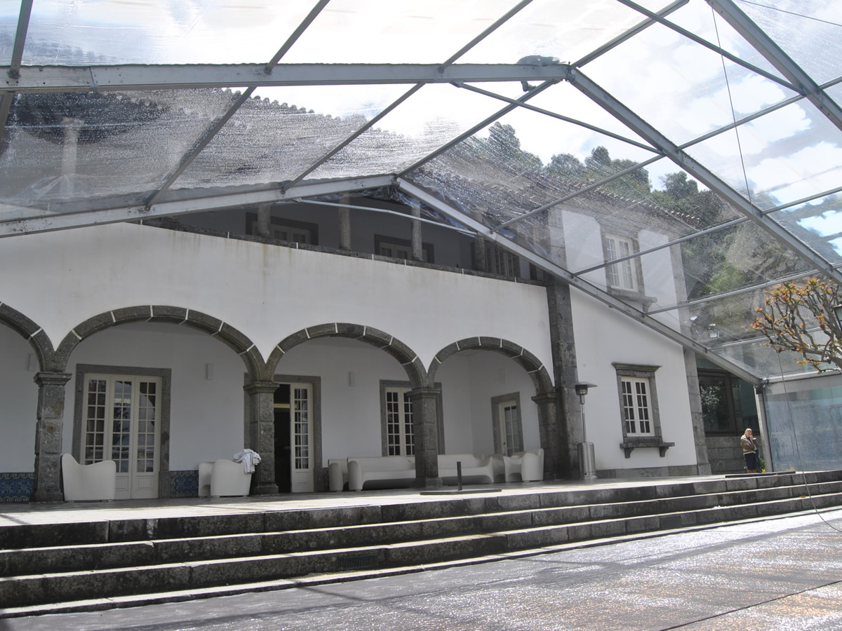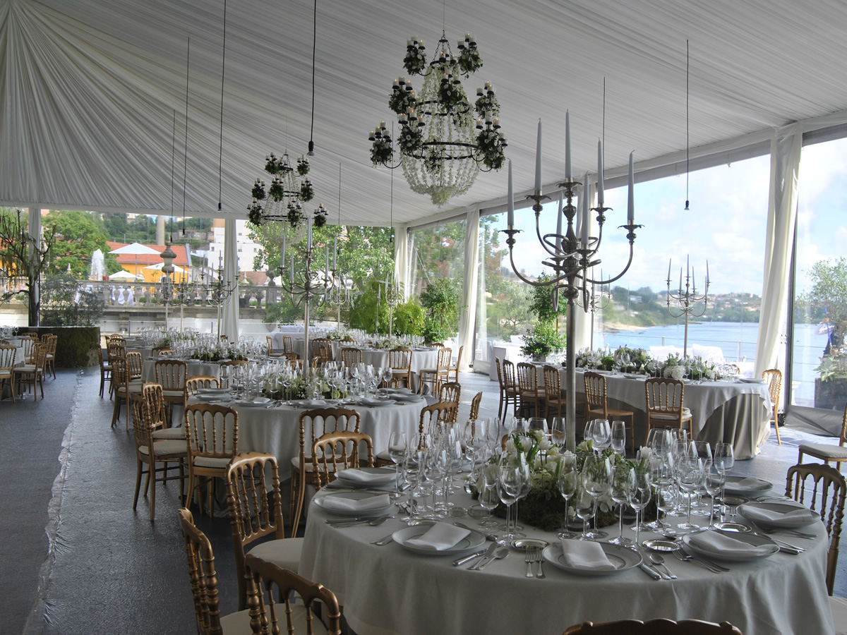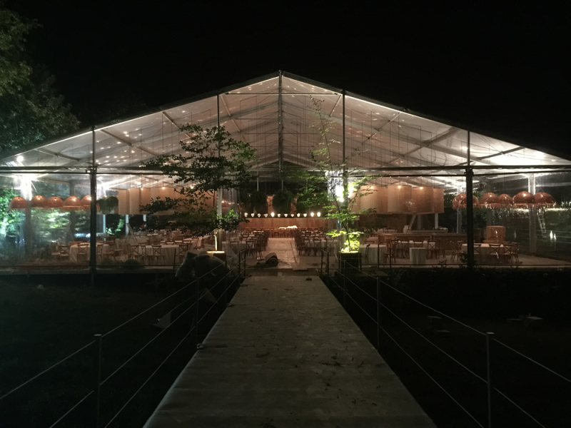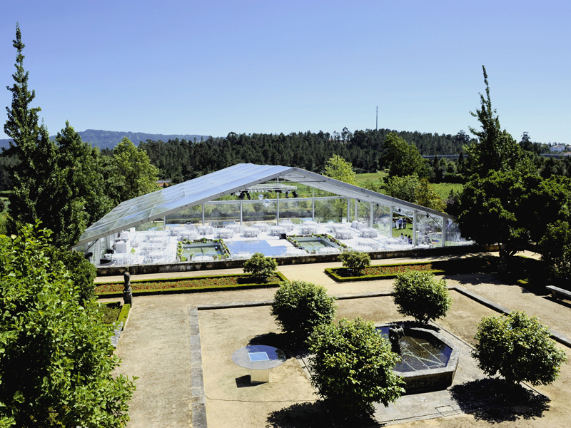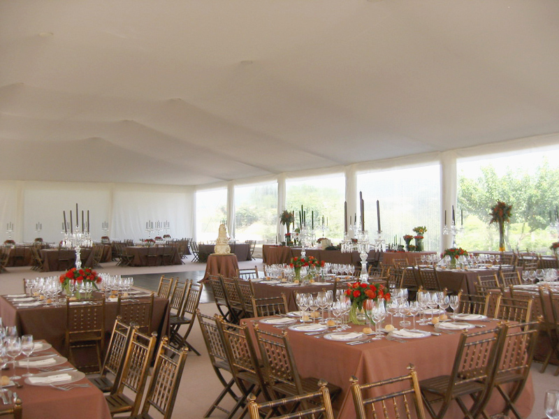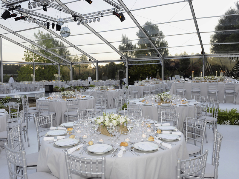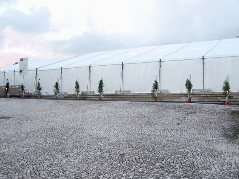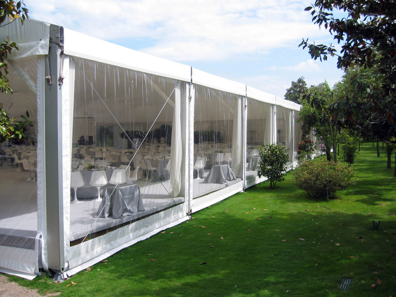 The tent has a self-supporting anodized aluminum structure and high quality PVC canvas, with the possibility of custom finishing.